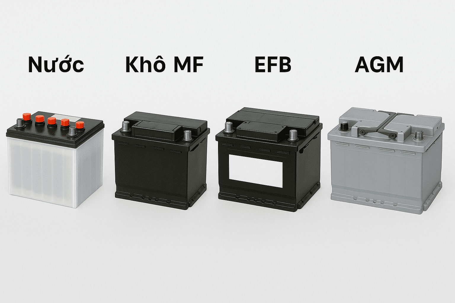 So sánh các loại bình ắc quy ô tô phổ biến: ắc quy nước, MF, EFB, AGM.