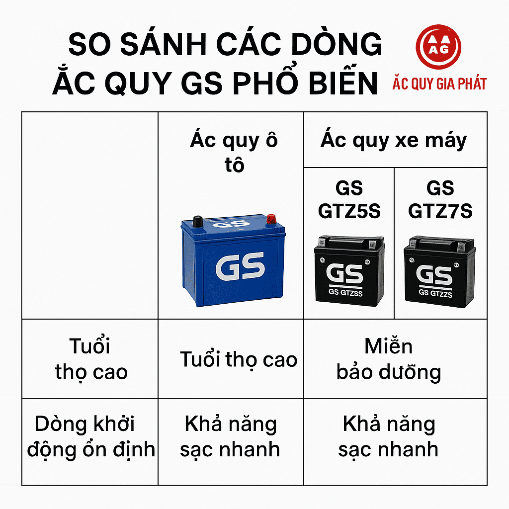 Các dòng ắc quy GS phổ biến cho ô tô và xe máy tại Ắc Quy Gia Phát Quận 2.