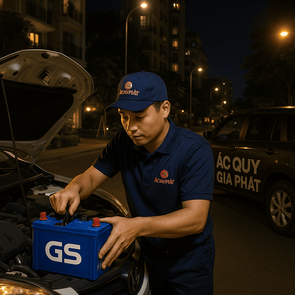 Ắc Quy Gia Phát - Đại lý ắc quy GS chính hãng, lắp đặt tận nơi tại Quận 2 (TP. Thủ Đức) vào buổi tối.